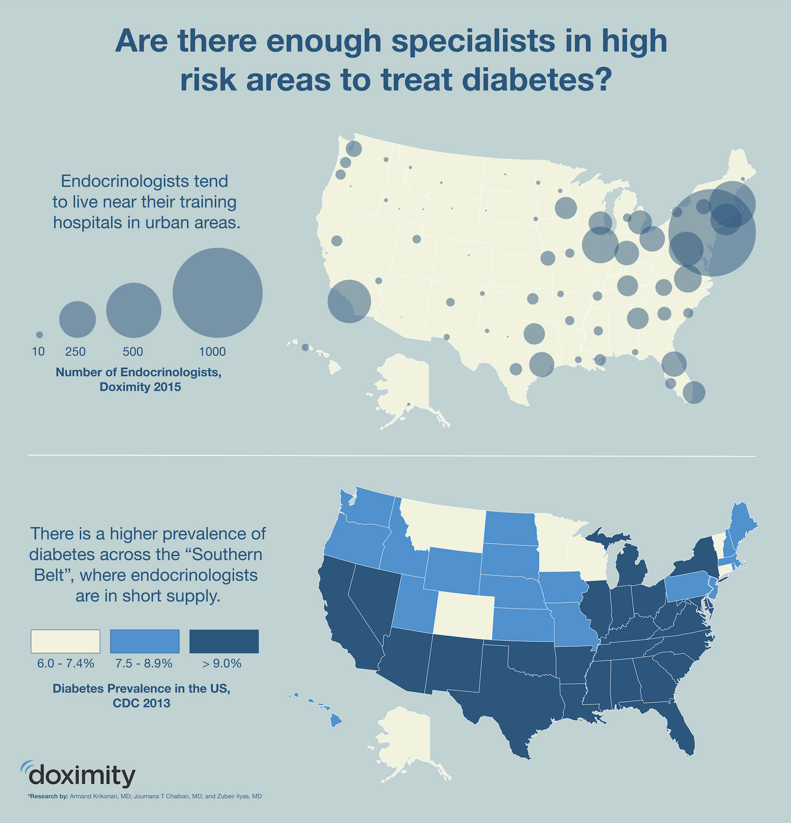 San Francisco, Calif., November 20, 2015 -- Doximity, the leading medical network for U.S. physicians, today announced the preliminary results from a study conducted by a team of researchers lead by Dr. Armand Krikorian, endocrinologist at Advocate Christ Medical Center, on the distribution of endocrinologists as it relates to the prevalence of diabetes and obesity in America. The research underscores the country’s physician distribution problem and highlights the need for targeted interventions to balance the workforce.